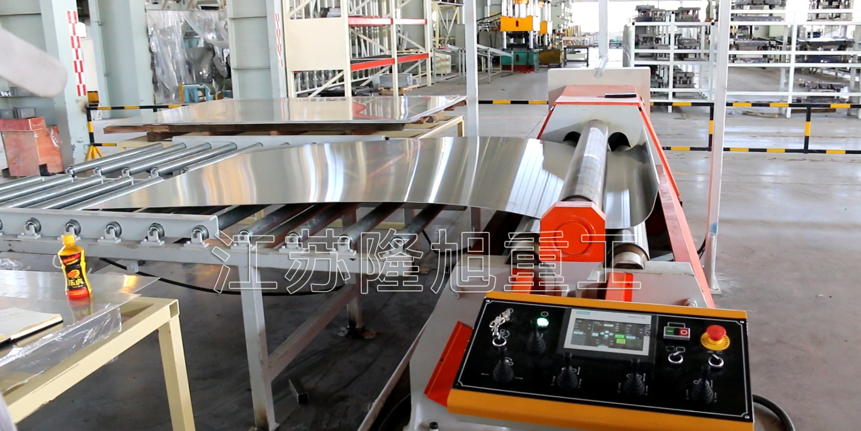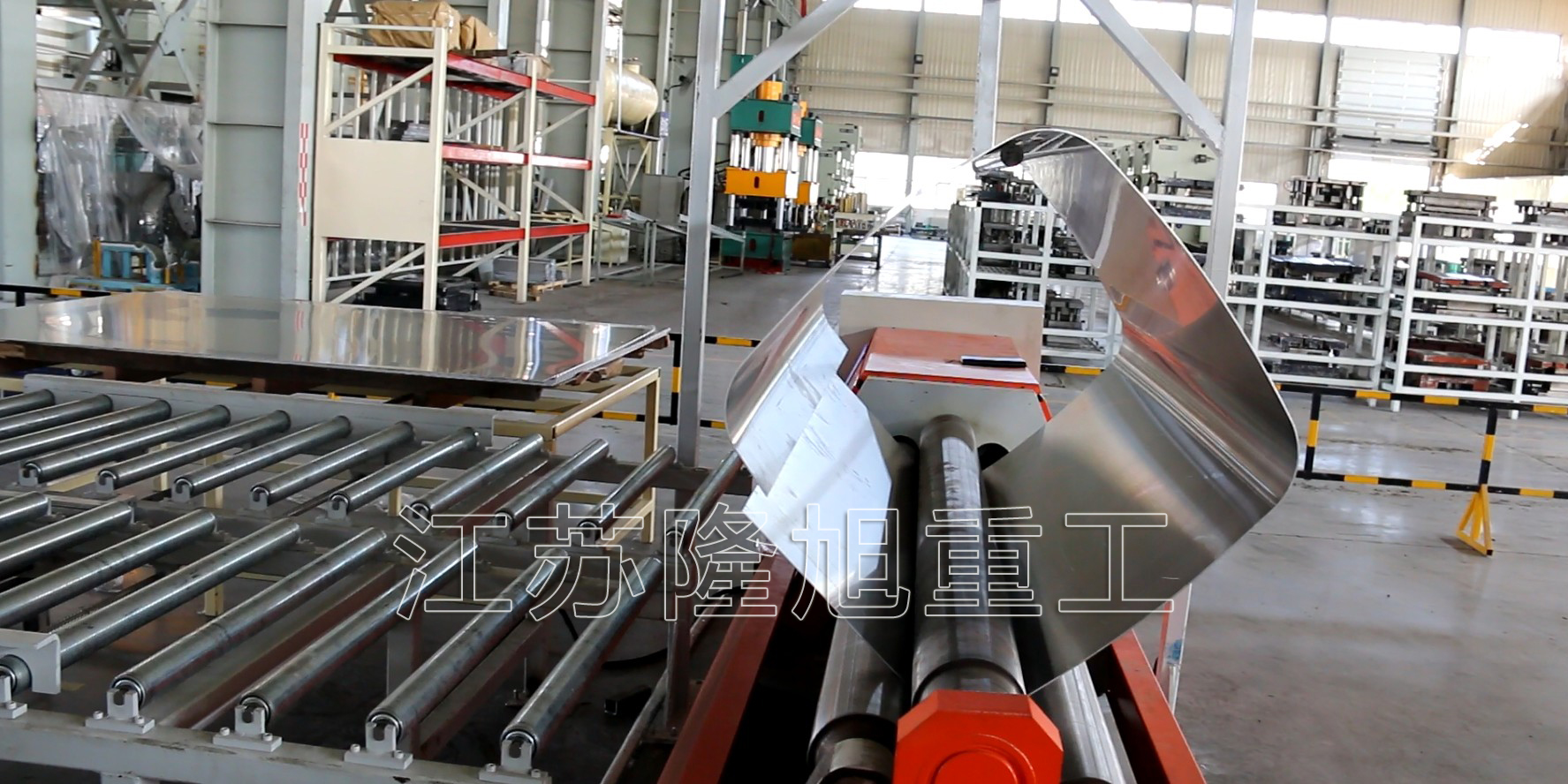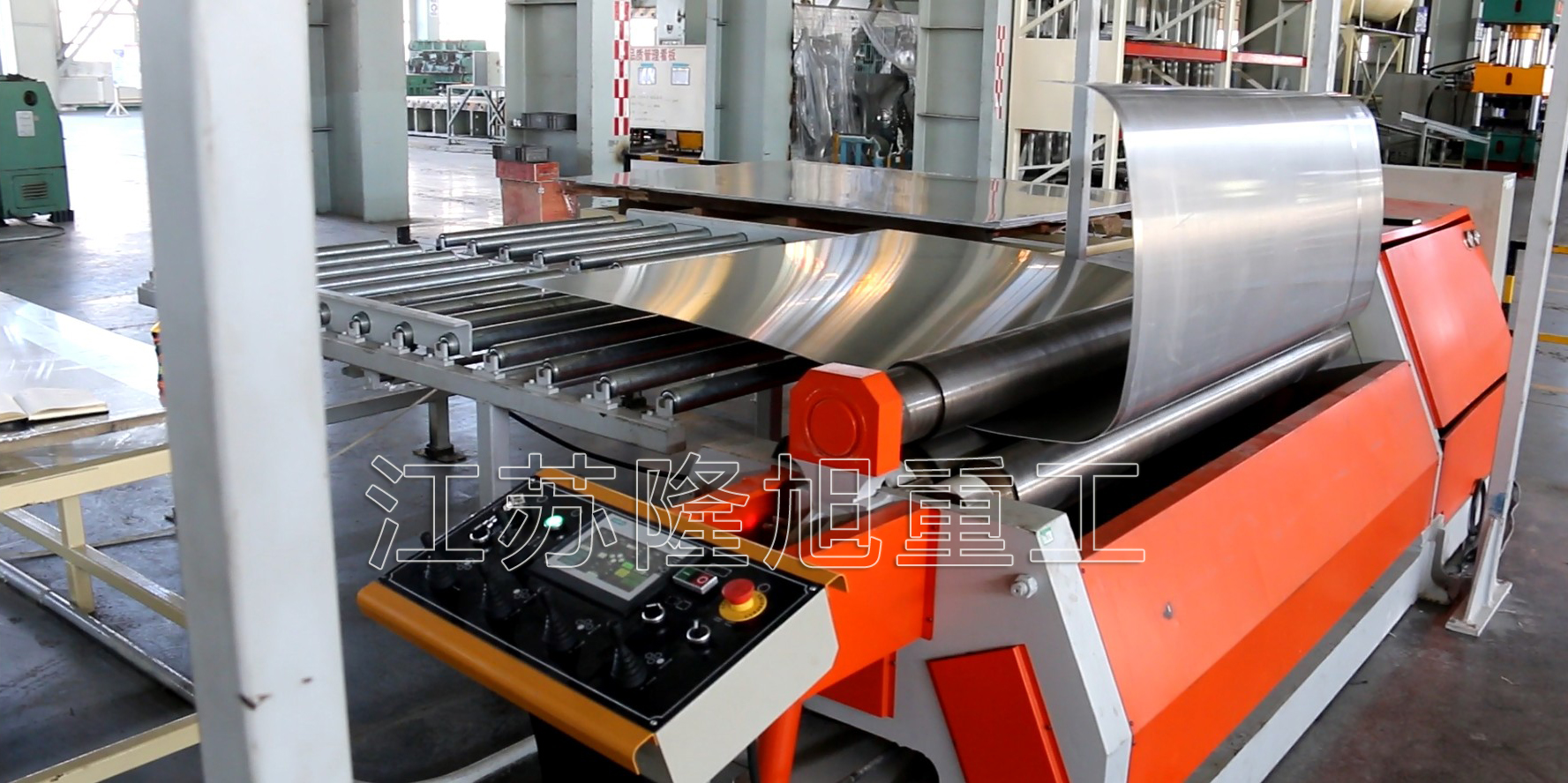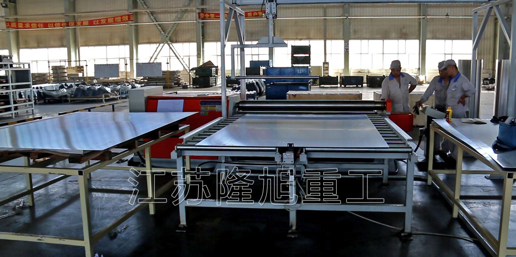 該生產線用于卷制容量800升的汽車油箱,其包括: 一臺全自動數控四輥卷板機,自動托料系統,電動送料軌道,氣動板料對正裝置,自動退料裝置。整個卷板過程從對料、進料、卷制、托料、退料實現全自動一體化。全程無人操作,有效降低企業人工成本,提高生產效率。