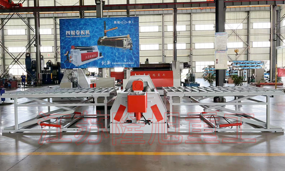 兩側設浮動側托架裝置,用于支撐還未完全成型直筒??煞乐贡 挵宀脑诰碇七^程中在下部變形而設計,通過油缸推動轉臂從而使托架上的托輥靠近所卷制的板材。根據卷制板材弧度的大小調節油缸伸縮的長度便能達到對板材變形控制的目的。