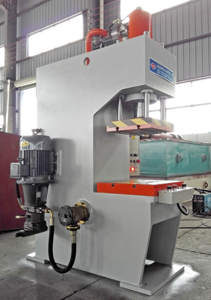 性能特點:本系列單柱式液壓機通過計算機優(yōu)化直立式C型結(jié)構(gòu)設(shè)計,剛性好,采用鋼板焊接,焊接后通過回火時效處理,確保機身永不變形。液壓系統(tǒng)安裝于機身內(nèi),外型美觀,結(jié)構(gòu)緊湊,操作方便。本系列液壓機設(shè)有獨立的液壓與電器控制系統(tǒng),采用按鈕集中控制,可實現(xiàn)定程和定壓兩種成型工藝,機器行程、壓力可在規(guī)定范圍內(nèi)調(diào)節(jié);本壓機壓頭采用四柱導向,具有抗偏載能力。